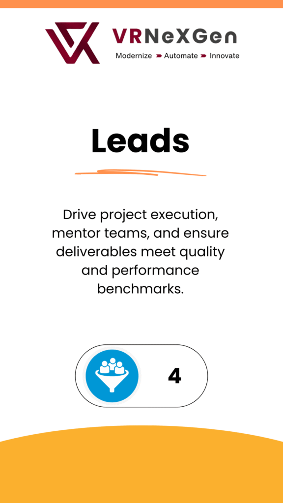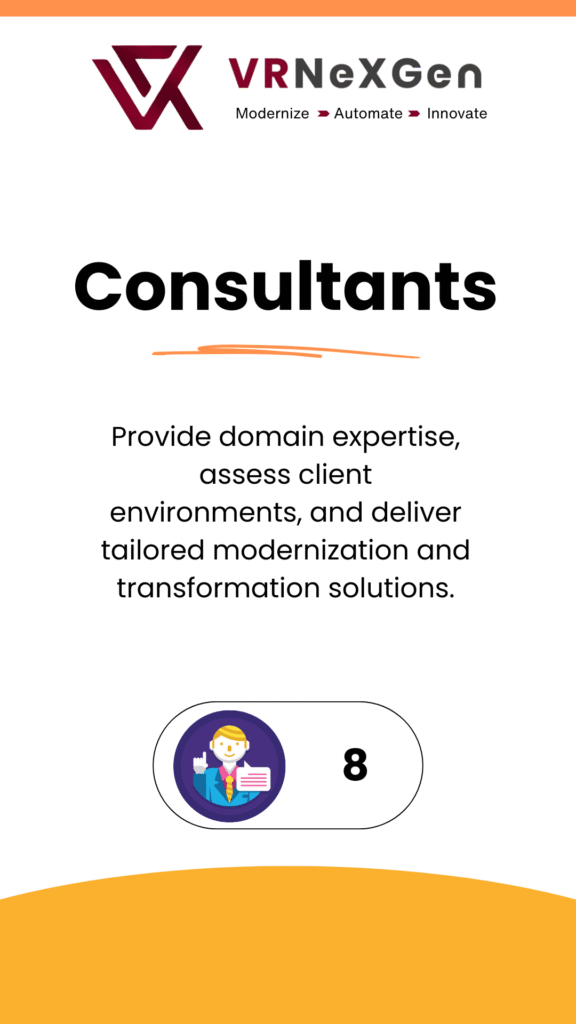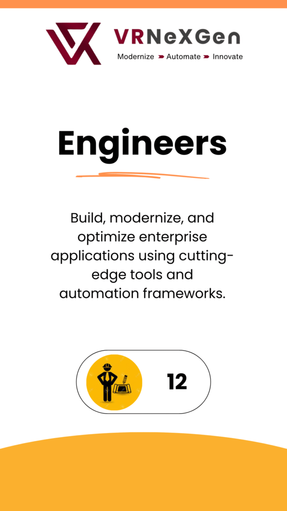 At VRNexGen Technologies, we’ve assembled a dynamic team of 50+ skilled professionals dedicated to mainframe modernization, DevOps, cloud integration, and AI-powered transformation. Our strength lies in a culture of ownership, agility, and deep technical knowledge—delivering enterprise-grade solutions with precision and passion.